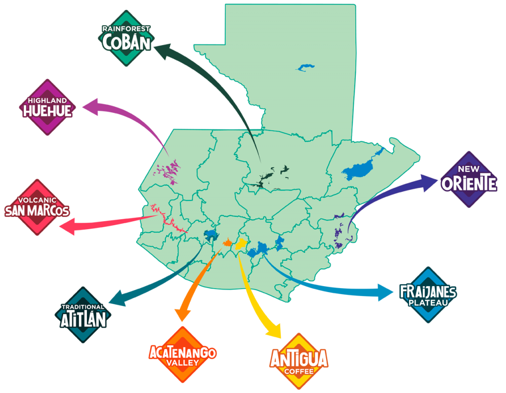 โดยประกอบด้วยโซนต่าง ๆ ดังนี้ Acatenango Valley, Antigua Coffee, Traditional Atitlan, Rainforest Coban, Fraijanes Plateau, Highland Huehue, New Oriente และ Volcanic San Marcos