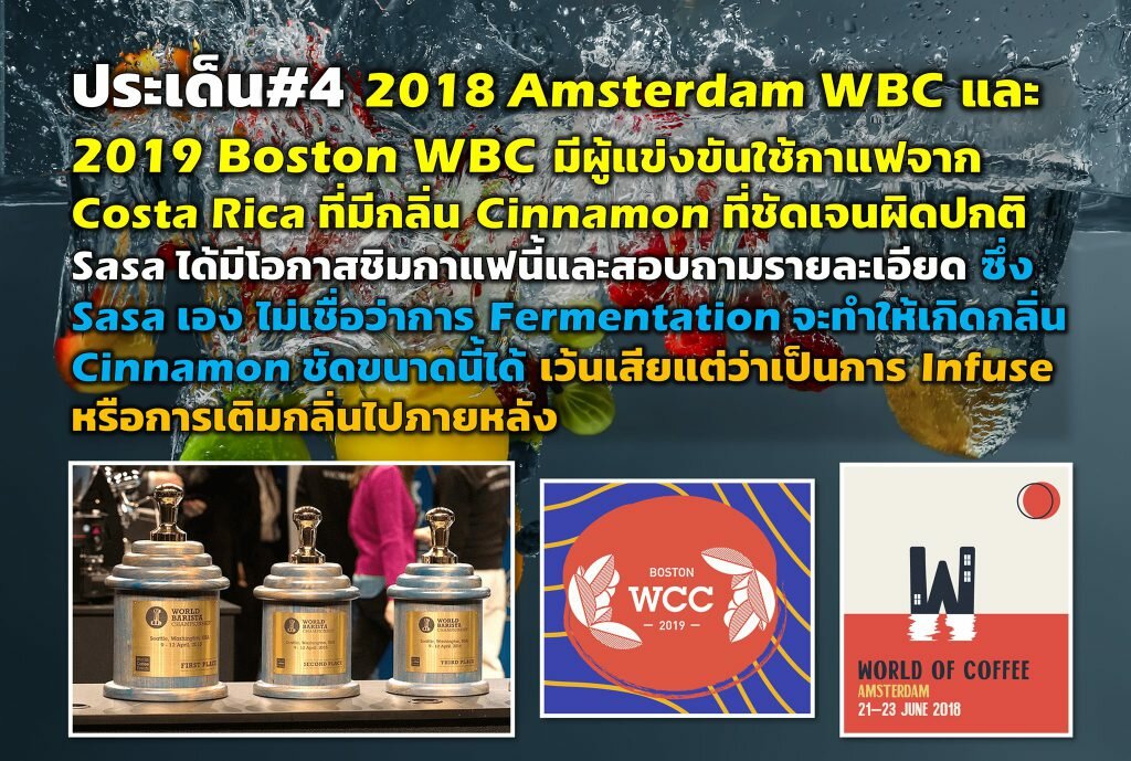Sasa ได้กล่าวถึงเวทีการแข่งขันกาแฟ 2018 WBC ที่ Amsterdam และ 2019 WBC ที่ Boston ที่ตัวเขาเองได้มีโอกาสชิมกาแฟของผู้เข้าแข่งขันและพบว่ามีกลิ่นของ Cinnamon ที่ชัดมากซึ่งเขาไม่เคยได้กลิ่นที่ชัดเจนขนาดนี้มาก่อน แม้ว่าเขาจะมีประสบการณ์ในการสร้างกลิ่นรสกาแฟผ่านกระบวนการ Fermentation มาอย่างมากมายก็ตาม ซึ่งเขาตั้งข้อสังเกตว่ากาแฟทั้งสองตัวนี้มาจาก Costa Rica แต่มาจากคนละไร่ แต่ทำไมมีกลิ่น Cinnamon เหมือนกันอย่างยิ่ง แม้ว่าผู้แข่งขันจะบอกว่าเป็นการ Special yeast ก็ตาม