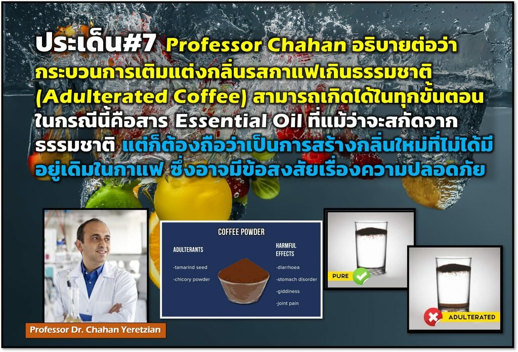 Professor Chahan Yeretzian ก็ให้คำตอบไว้อีกว่า กาแฟที่แต่งเติมกลิ่นที่มากกว่าธรรมชาติเรียกว่า Adulterated Coffee ซึ่งเอาเข้าจริงก็นับตั้งแต่การใช้เชื้อจุลินทรีย์จากภายนอกเหนือจากที่มีมาจากธรรมชาติ ไปจนถึงการเติมกลิ่นด้วยการ infuse สารต่างๆ ไม่ว่าจะด้วยการแช่หรือการ spray รวมไปถึงการใช้ organic acid หรือการใช้ผลไม้หรือสารอาหารต่างๆในการหมักด้วย และไปไกลถึงการ brew กาแฟที่ปัจจุบันมีการใช้น้ำที่ผสมกรดผลไม้หรือปรับค่ากรดด่างด้วยสารเคมีบางอย่างกันแล้ว ทั้งหมดนี้ควรจะเรียกว่ากาแฟที่มีการแต่งกลิ่นเกินกว่าธรรมชาติทั้งหมด