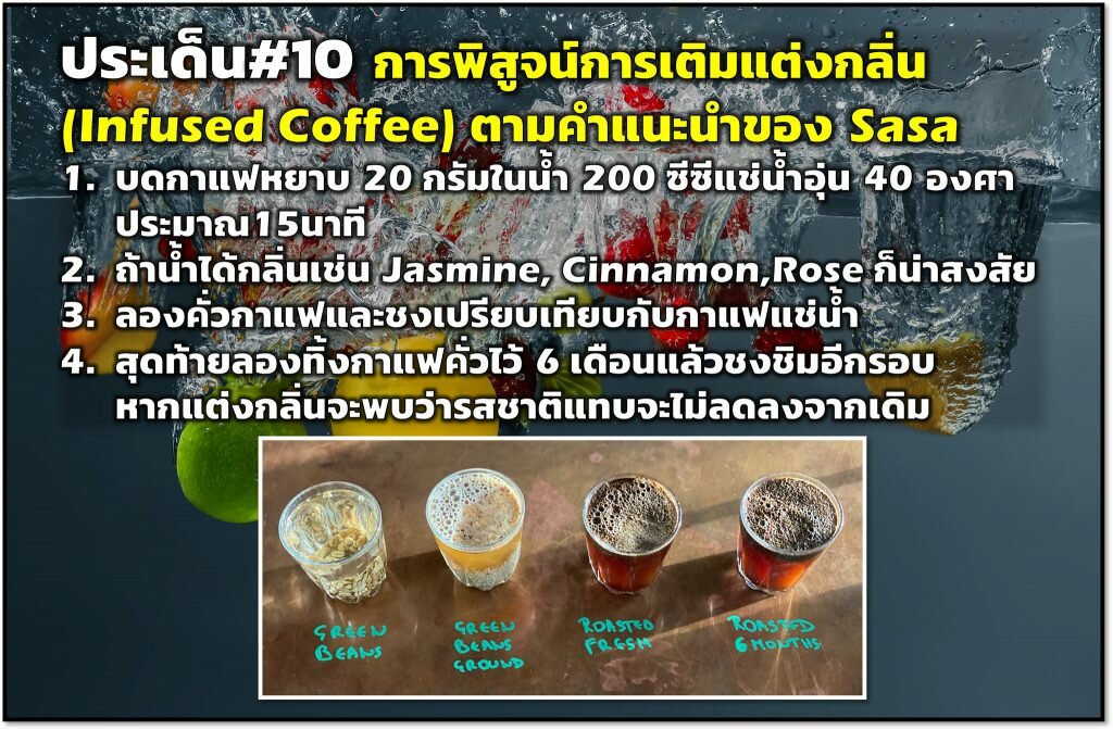 - เอากาแฟไปคั่วแล้วชงชิมอีกทีว่าได้กลิ่นเหมือนน้ำแช่สารกาแฟหรือไม่