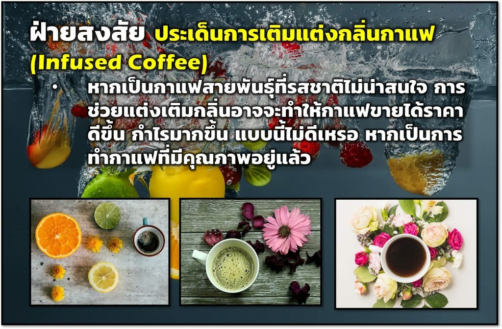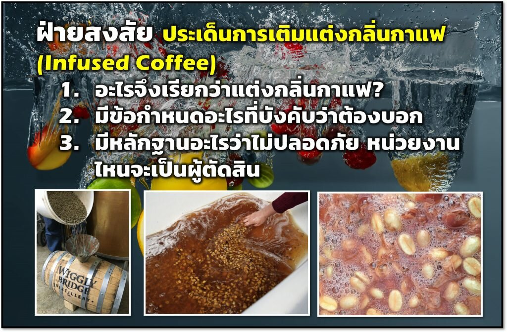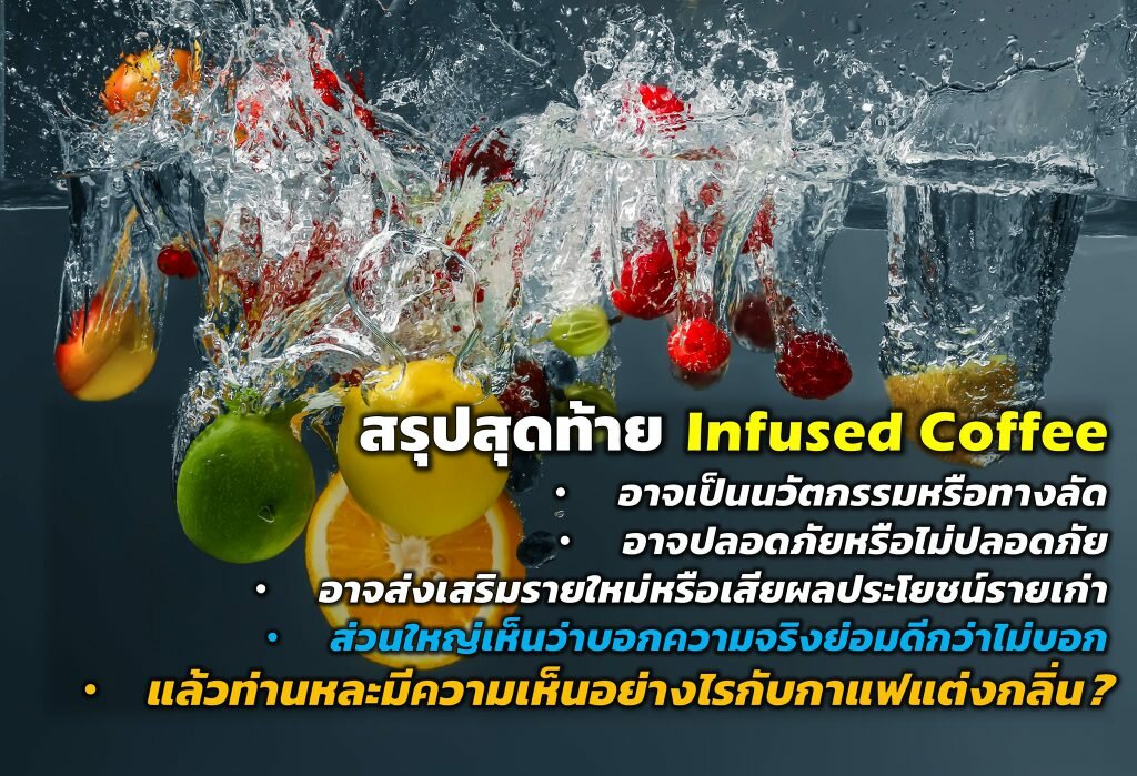 การเติมแต่งกลิ่นรสในกาแฟ (Infused Coffee) มีอยู่จริง ขึ้นอยู่กับว่าจะมองมุมไหนและให้คำจำกัดความว่าอย่างไร จะมองว่าเป็นนวัตกรรมหรือทางลัด หรือจะมองว่ามีปัญหาความปลอดภัย หรือจะมองว่าทำให้อนาคตของอุตสาหกรรมกาแฟตกต่ำ หรืออาจจะทำให้กระจายรายได้สู่เกษตรกรทั่วไปจะได้ไหม อันนี้คงต้องให้สังคมชาวกาแฟเป็นผู้ตอบแล้ว